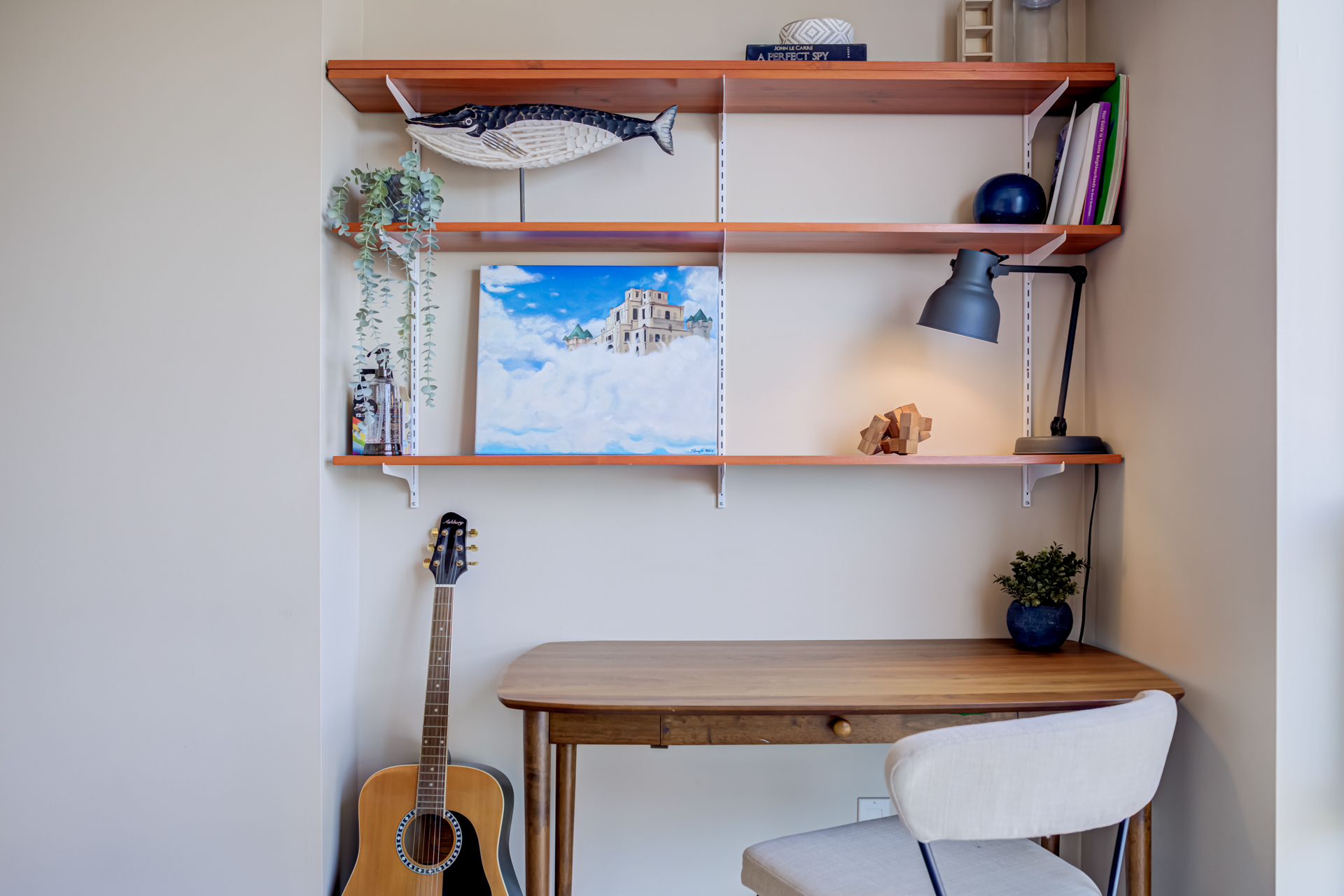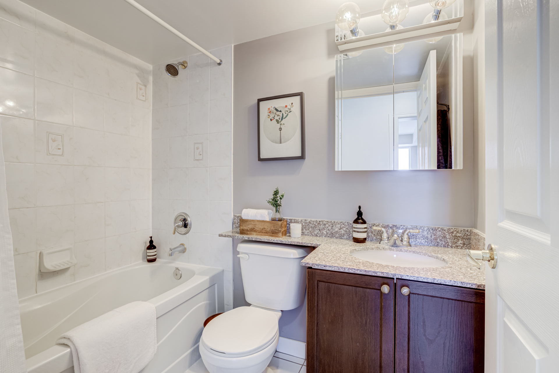 Move in ready one bedroom suite with balcony. A terrific floorplan, spacious with a big functional kitchen. Full-size appliances and breakfast bar with chalkboard. This suite is so well cared for. White Oak laminate floors and broadloom in great shape. King sized bedroom fits a home office. Overall excellent ensuite storage with cubbies and closet organizers. Double wide front hall closet. Balcony is topped with stylish wood decking [included] and features a really nice downtown skyline view. This suite includes parking and locker.